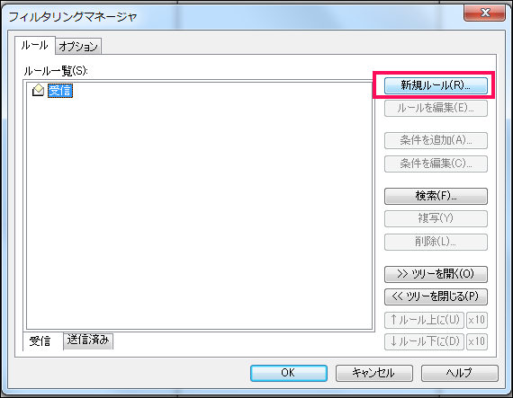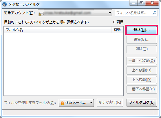 【2】フィルタリングマネージャのウィンドウが開いたら「新規ルール」をクリックします。