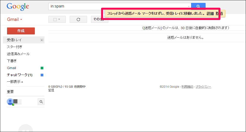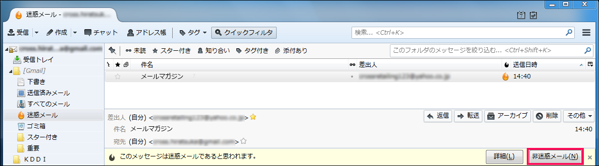 【2】スレッドから迷惑メールマークをはずし受信トレイに移動しました。