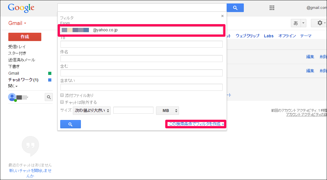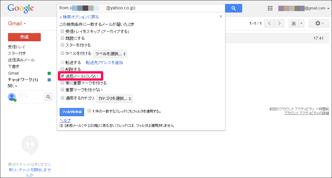 【5】迷惑フォルダに入れたくないメールアドレスをFromに入力し、「この検索条件でフィルタを作成」をクリックします。