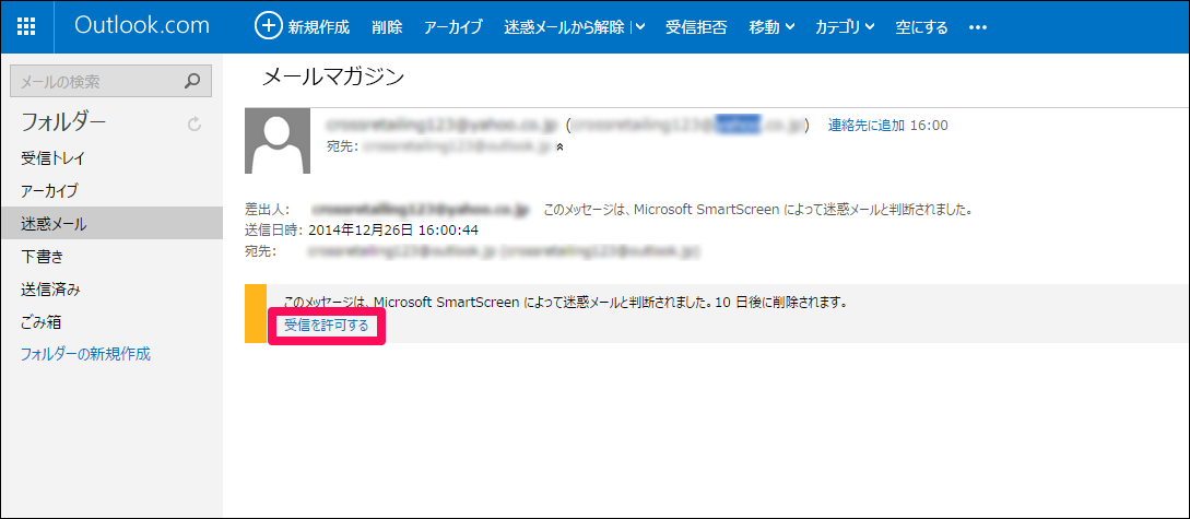 【1】迷惑メールに入ってしまったメール(迷惑メールフォルダーに振り分けたくないメール)を開き「受信を許可する」をクリックします。