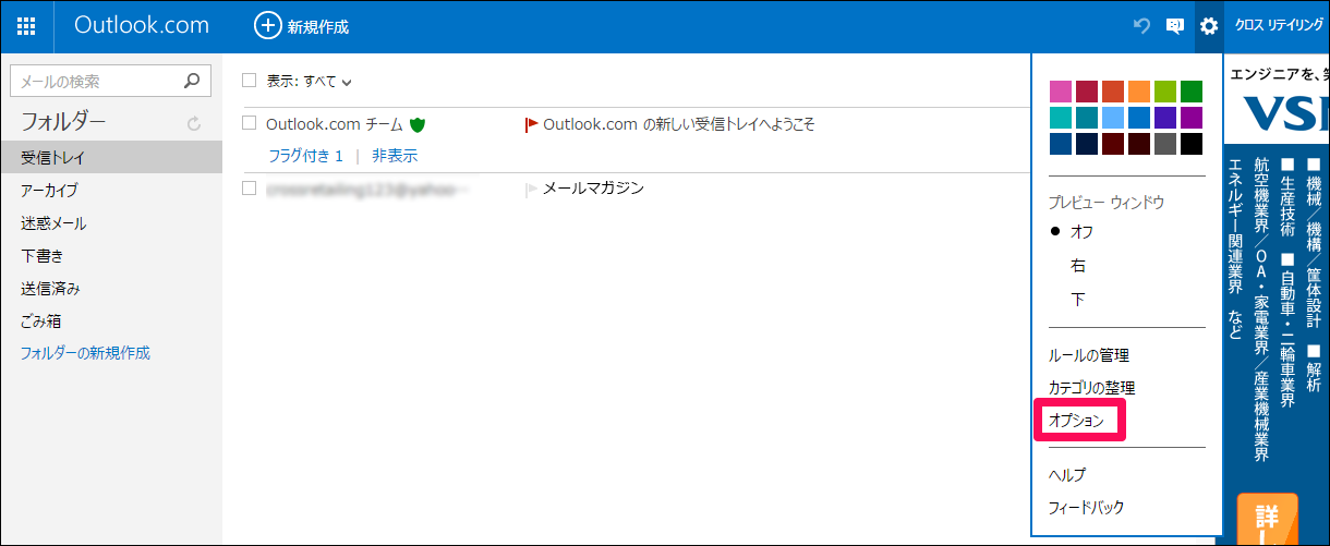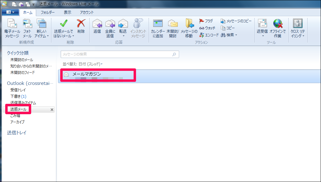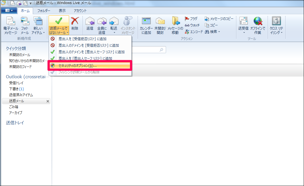 これからクロスリテイリングからのメールを迷惑メールフォルダーではなく、 受信箱に入るようにOutlookの設定していきます。