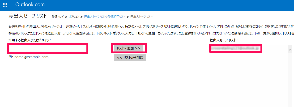 【6】「許可する差出人またはドメイン」の欄に迷惑メールフォルダーに振り分けたくない友人やメールマガジンの差出人メールアドレス・ドメインを入力し、「リストに追加」をクリックします。