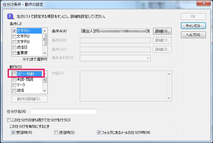 【10】「仕分け条件・動作の設定」画面に戻りますので、「動作」で「コピー・移動」をチェックします。