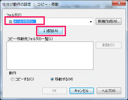 【12】「フォルダ」で、フォルダ設定の確認と、「コピー・移動先フォルダの一覧」で振り分けたいフォルダが設定されているかを確認します。下の「動作」で「移動する」にチェックを入れ、OKボタンをクリックします。