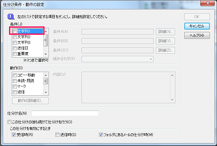 【5】「仕分け条件・動作の設定」画面で「条件」の「文字列1」をチェックをします。