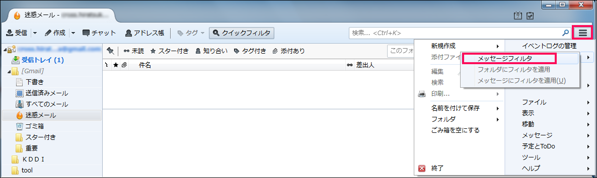 【2】右上のメニュボタンをクリックし、「ツール」から「メッセージフィルタ」を選びクリックします。