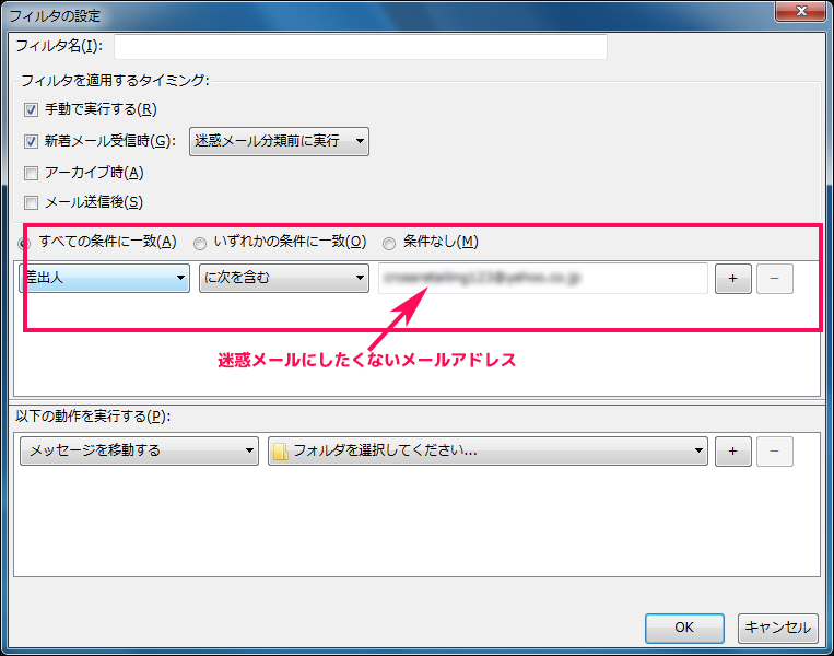 【13】「フォルダ」で、フォルダ設定の確認と、「コピー・移動先フォルダの一覧」で振り分けたいフォルダが設定されているかを確認します。下の「動作」で「移動する」にチェックを入れ、OKボタンをクリックします。