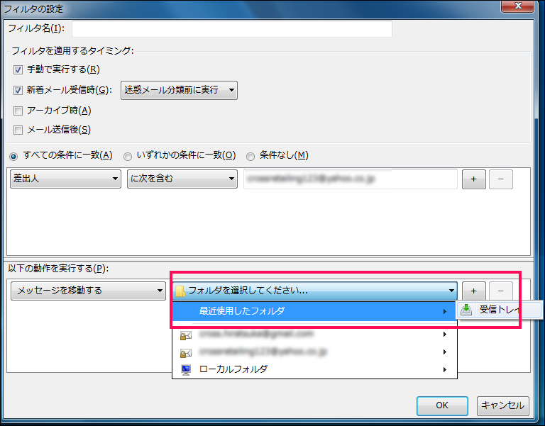【4】アクションの欄を「振り分け」「フォルダへの振り分け」に設定し、受信箱をクリックします。「フォルダへの振り分け**Set**」という表示になったら、OKをクリックします。