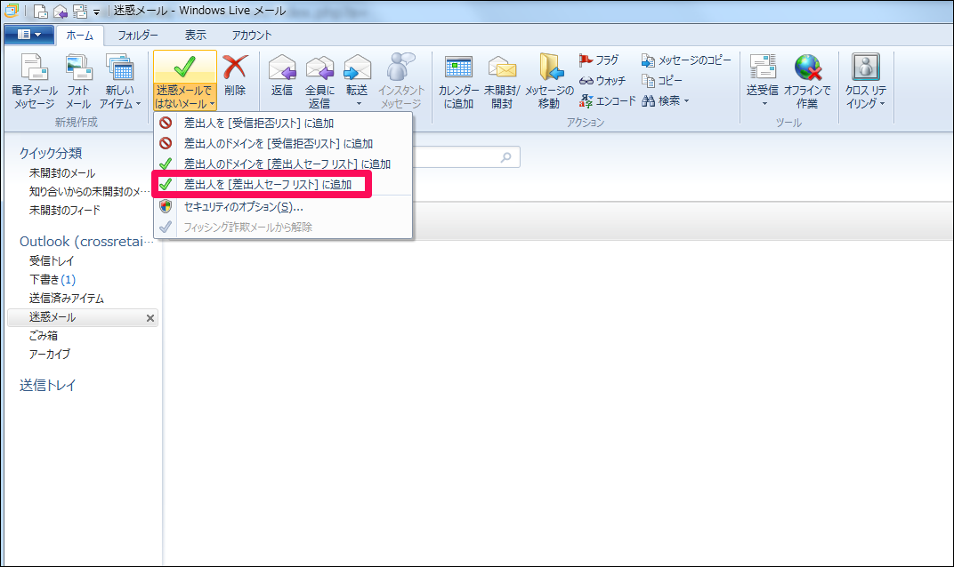 これから弊社からのメールを迷惑メールフォルダーではなく、 受信箱に入るようにWindowsLiveメールの設定していきます。