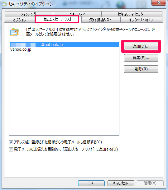 【4】「差出人セーフリスト」タブを選択し、追加をクリックします。