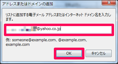 【5】入力欄に迷惑メールに入れたくないメールアドレス(弊社のメールアドレス)を入力し、OKをクリックします。
