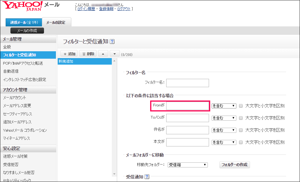 【4】条件のなかの「fromが」にメルマガの差出人メールアドレス・ドメインを入力します。