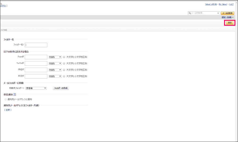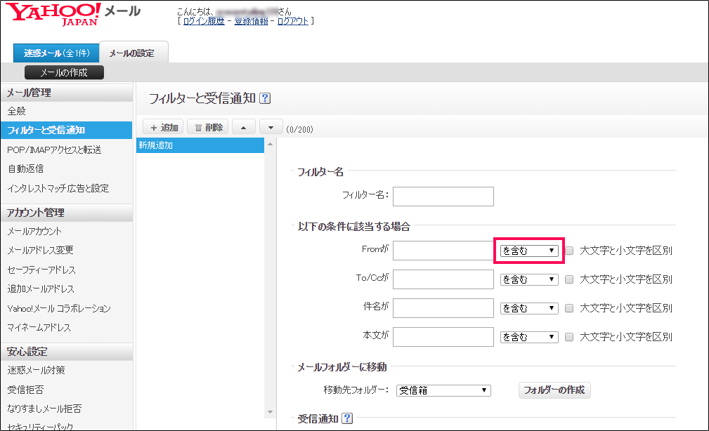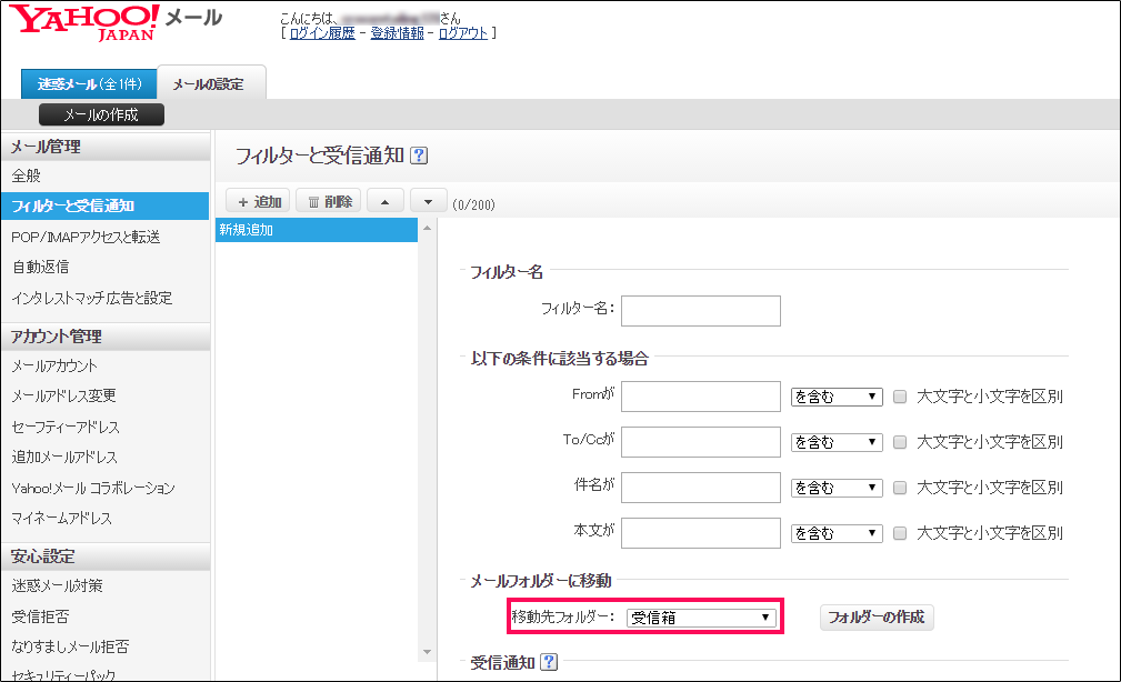 【6】その下の「メールをフォルダに移動」から、移動先フォルダを「受信箱」に設定します。